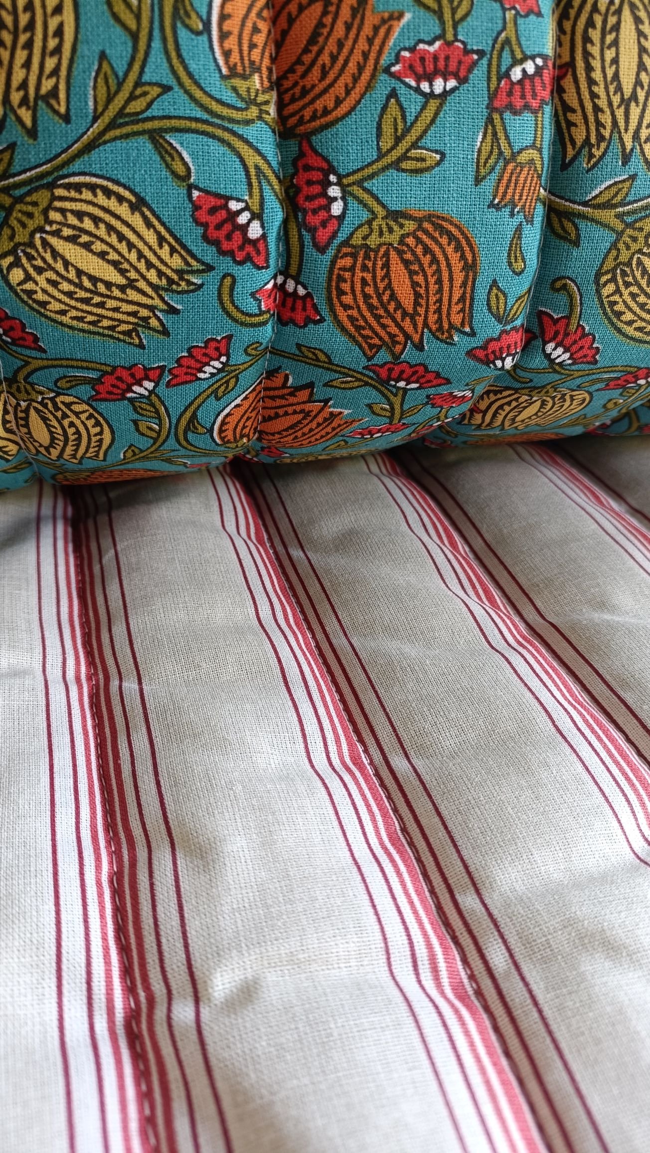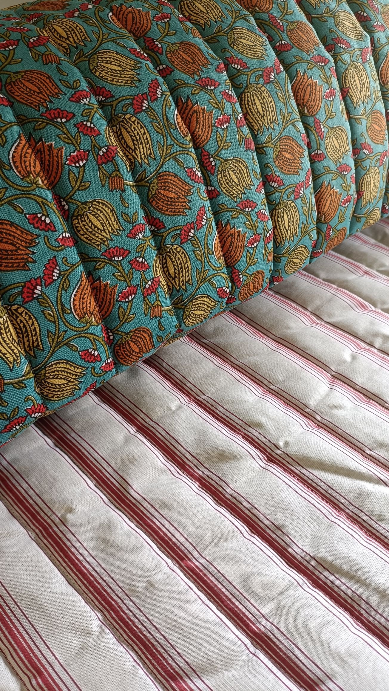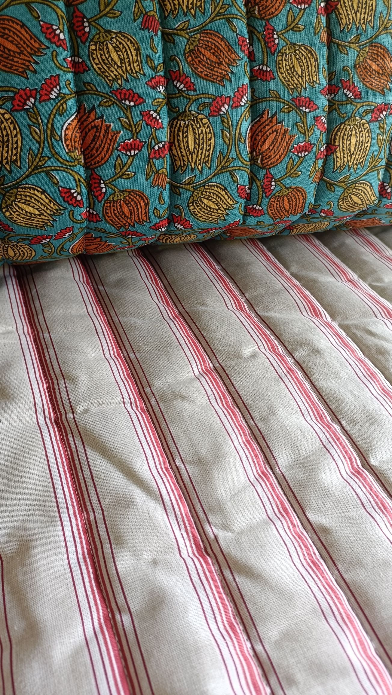 Descubre el acolchado reversible que combina el estilo indio con un estampado de flores en una cara y rayas rojas clásicas en la otra. Fabricado en percal de algodón francés de alta calidad, este tejido es una excelente opción para destacar en cualquier proyecto creativo.