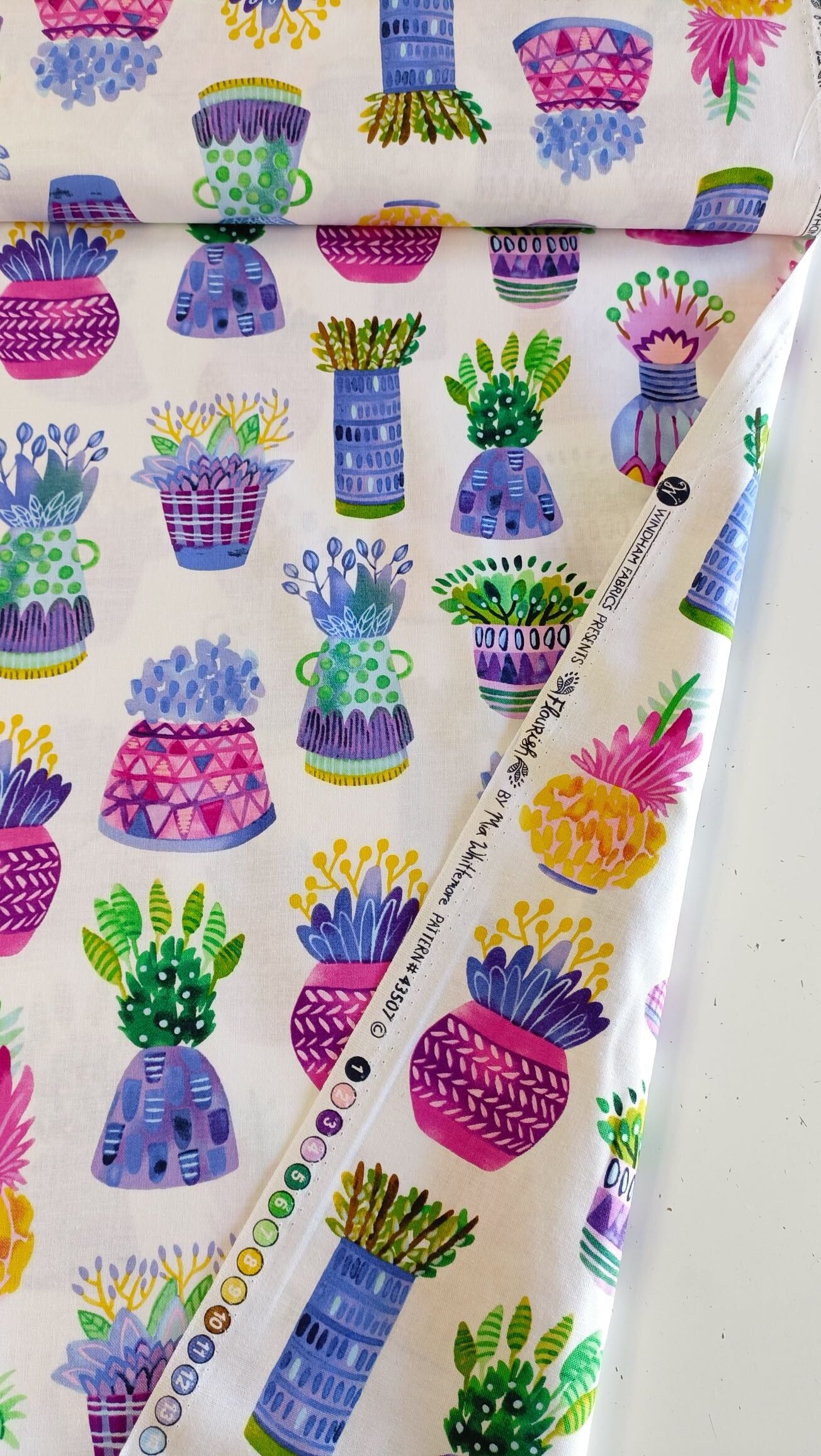 Dale vida a tus proyectos de patchwork con este algodón americano blanco de alta calidad. Con un diseño encantador de jarrones y flores en tonos morados y verdes, este tejido de Windham Fabrics es perfecto para crear piezas únicas y sofisticadas.