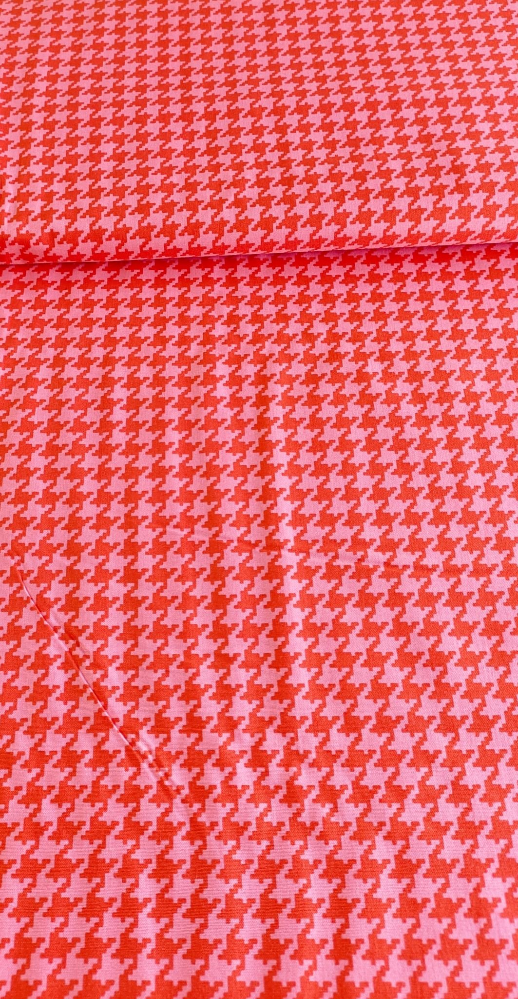 La combinación de colores rosa y rojo en el clásico patrón de pata de gallo ofrece un estilo sofisticado y vibrante. Es perfecto para crear prendas de vestir modernas, accesorios únicos, o incluso proyectos de decoración del hogar que capturen miradas.