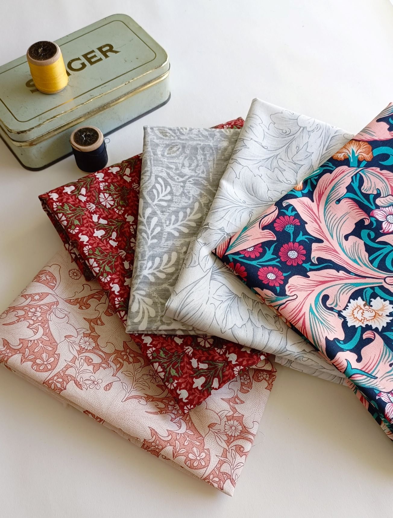 Pack de 4 fat quarter o retales de algodón 100% de Morris&Co con icónicos estampados como Artichoke, Blackthorne, Michaelmas Daisy y The Savric, en colores luminosos para primavera, perfectos para neceseres, bolso, monederos, aplicaciones y un sin fin de ideas.