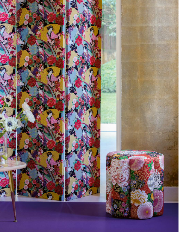 Su estampado inspirado en los motivos tradicionales japoneses de geishas con abanicos dorados y flores resulta elegante y sofisticada, aportando lujo a cualquier proyecto de costura.