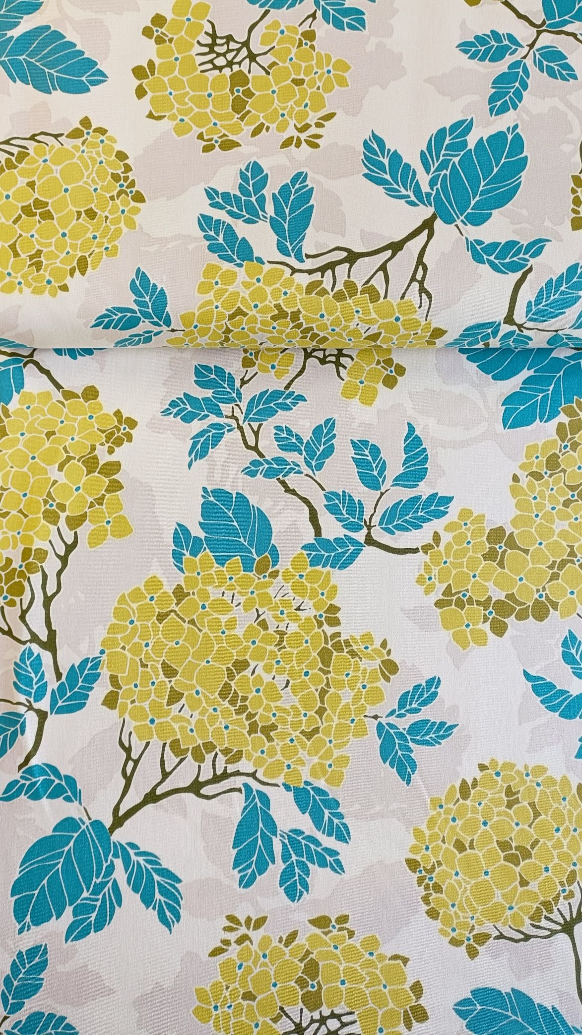 El estampado floral con hortensias ofrece un estilo sofisticado y atemporal que eleva cualquier proyecto. Su combinación de tonos marfil y diseño artístico le da el toque perfecto de lujo y originalidad. Es un excelente material para confeccionar ropa, cortinas, fundas de cojines, y más.