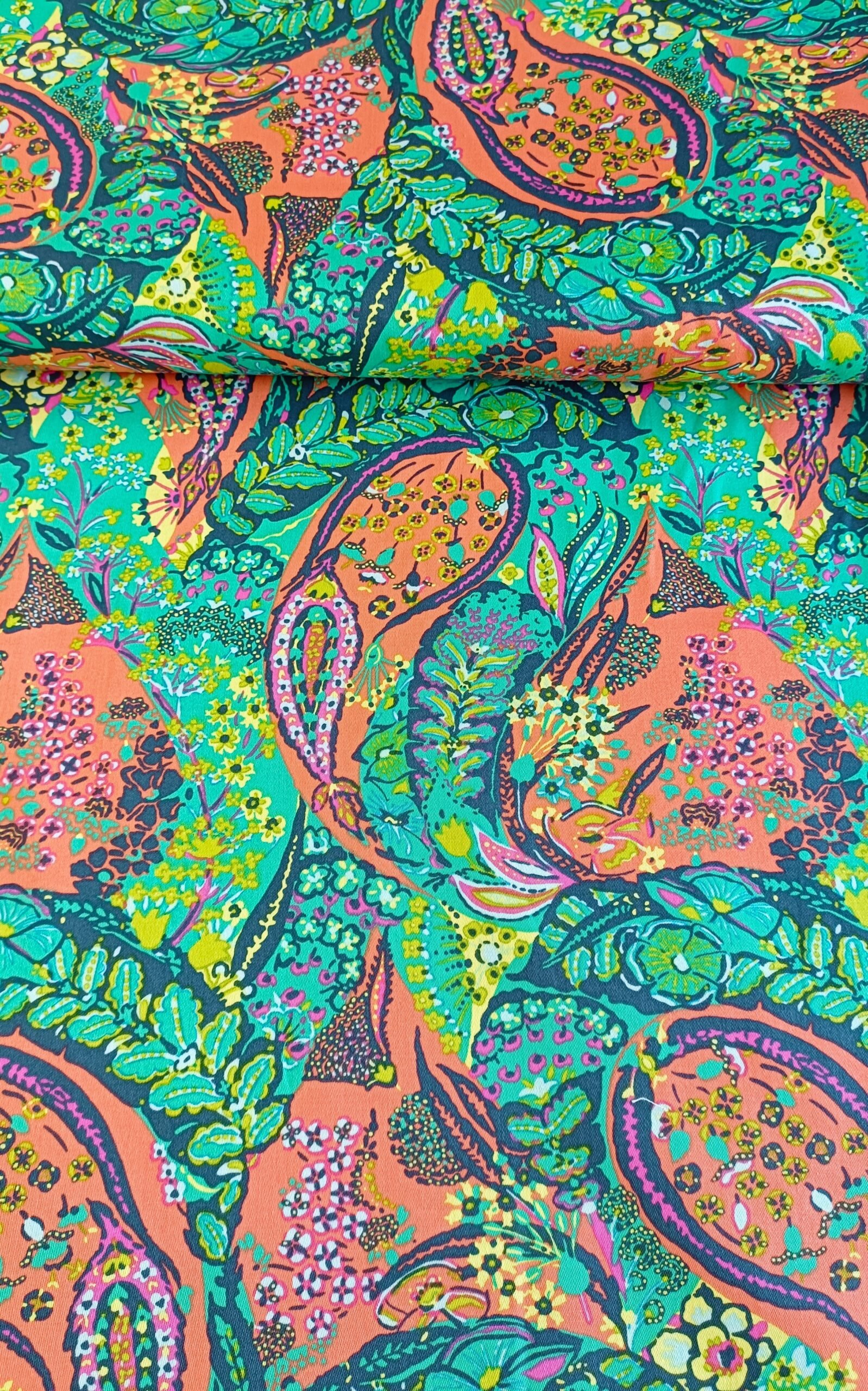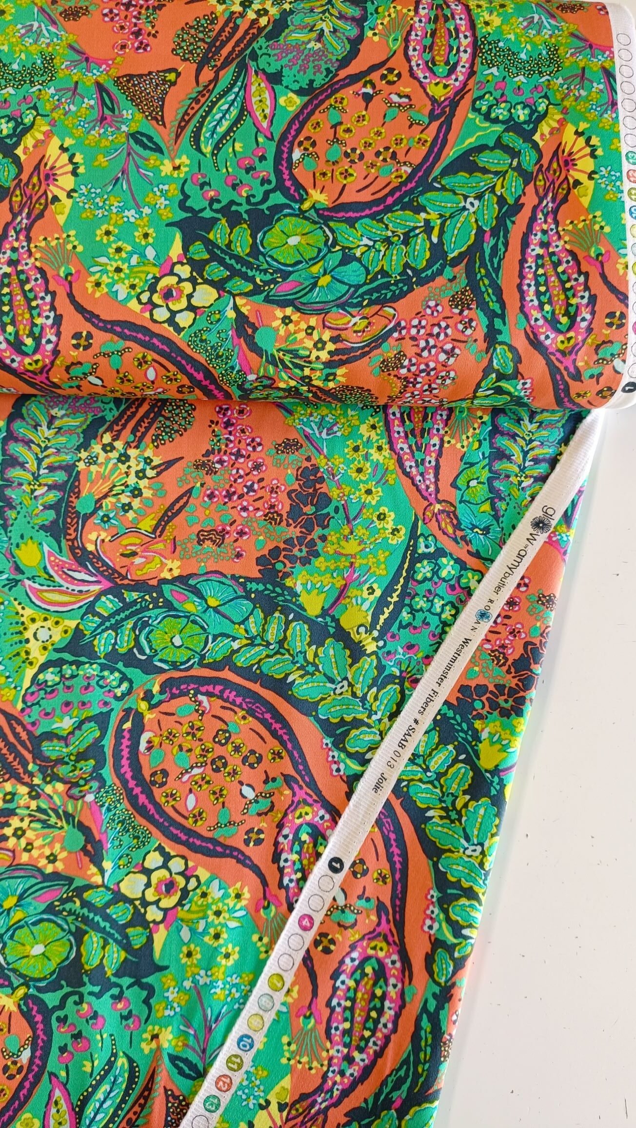 Descubre la belleza única del satén de algodón verde cachemir adornado con motivos florales exclusivos. Perfectamente diseñado por Amy Butler para Rowan Fabrics, este tejido combina elegancia y funcionalidad para darle un estilo distintivo a tus proyectos creativos.