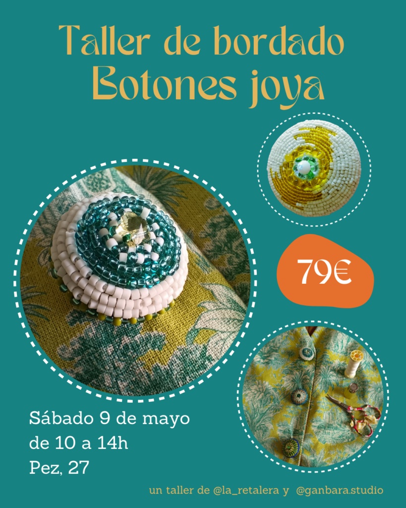 El próximo sábado 9 de mayo, de 10:00 a 14:00, en La Retalera tenemos uno de esos encuentros especiales: un taller de bordado de botones joya de la mano de Estitxu Pecharromán, alma creativa de Ganbara Studio.